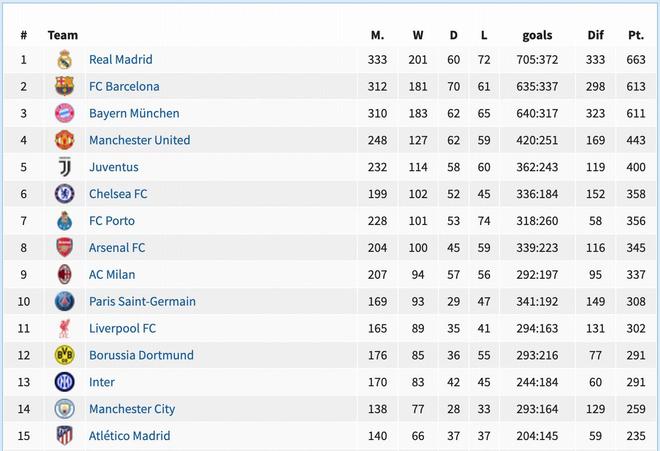 这份欧冠战绩榜的第15名是马德里竞技,床单军团6次进入四强3次杀进决赛,均与冠军失之交臂。