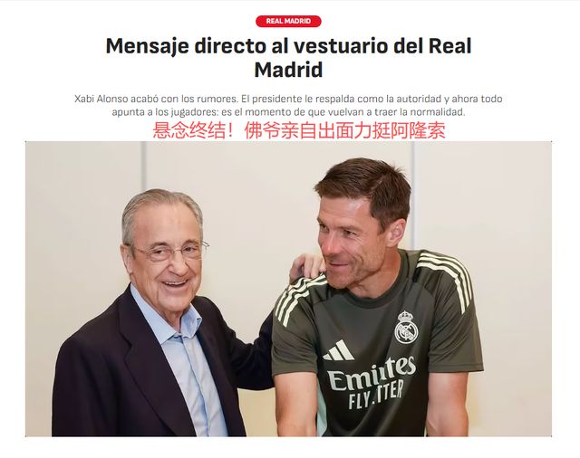 《阿斯报》表示,皇马更衣室已经知道俱乐部的态度和立场:弗洛伦蒂诺支持阿隆索。皇马全队就该拿出端正的态度进行训练、比赛,听阿隆索的安排和指导。在皇马内部,姆巴佩、居勒尔、琼阿梅尼、赫伊森、卡雷拉斯都是阿隆索的支持者,现在该轮到维尼修斯、罗德里戈等球员表态了。