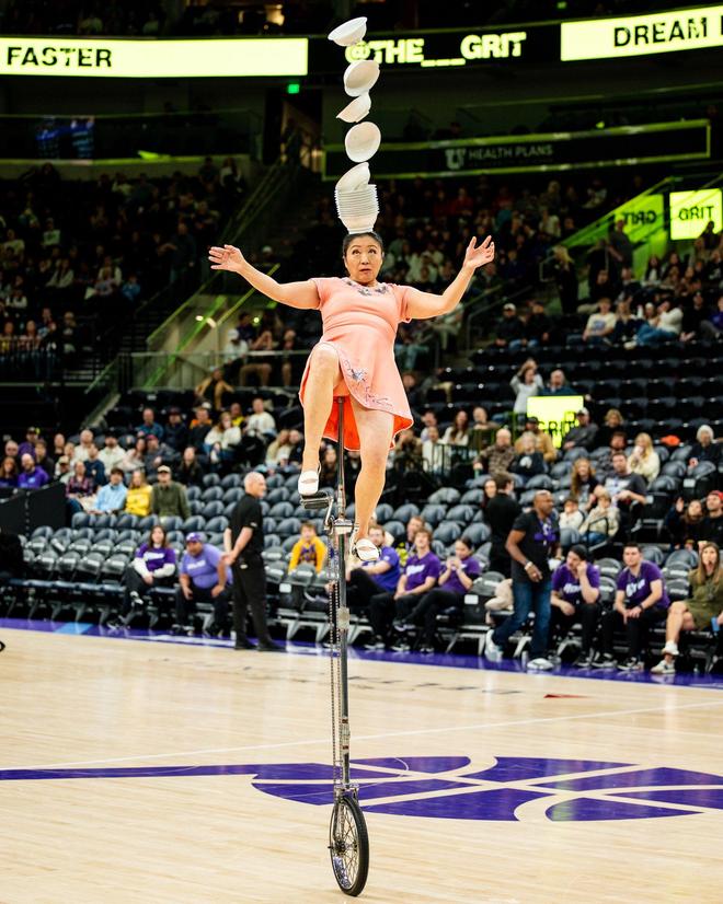 北京时间12月8日,雷霆做客盐湖城与爵士交手,牛大妈今日也恰好来到了这里进行了表演,在这场比赛中场休息期间,有5分钟是属于咱们的牛大妈的,在两米多的独轮车上,牛大妈映衬着《大花轿》的BGM左脚不停地来回踩踏寻找平衡,右脚则将一个个正反不同的大碗摞在一起,随后牛大妈右脚一抖这些正反不一的大碗就像一个个听话的孩子一样落在了牛大妈的头上,无他,唯手熟尔?不,牛大妈是唯脚熟尔。