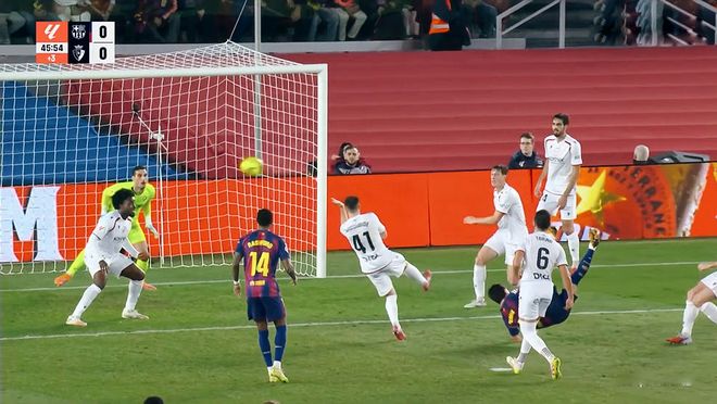 整个上半场,比赛几乎完全呈现一边倒,客场作战的奥萨苏纳只有在开场的几分钟,阵型相对激进。随后“541”的站位全面回防,三条线的距离非常小,禁区附近组成了密集的阵型,不给巴萨渗透的机会。